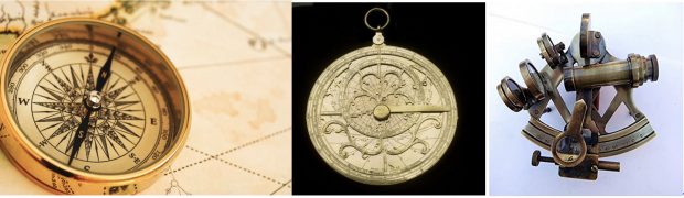 Aujourd’hui les instruments de navigation modernes comme le GPS permettent en temps réel de se situer sur une carte, mais dans l’Antiquité, les navigateurs utilisaient les astres pour s’orienter. et se repérer en mer. De jour, par rapport à la position du soleil et la nuit par rapport à la position des étoiles. Ils ont inventé des instruments comme l’astrolabe puis le sextant.
